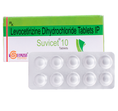 Suvicet-10mg Tablet falls into the category of antihistamine medications, and it is specifically utilized to address a variety of allergic conditions. These conditions encompass hay fever, conjunctivitis, as well as certain skin reactions like eczema, hives, and responses to insect bites and stings. Suvicet-10mg Tablet is also effective in providing relief from bothersome symptoms such as watery eyes, runny nose, sneezing, and itching, contributing to an improved overall sense of well-being.
