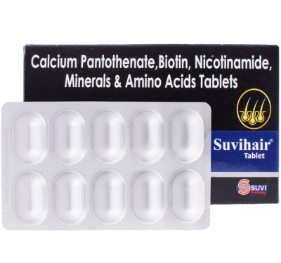 Suvihair Tablet dietary supplement containing calcium pantothenate, biotin, nicotinamide, minerals and amino acids to promote hair health and overall well-being. Enriched with a synergistic blend of essential nutrients, minerals, and amino acids, this supplement helps in supporting various bodily functions.